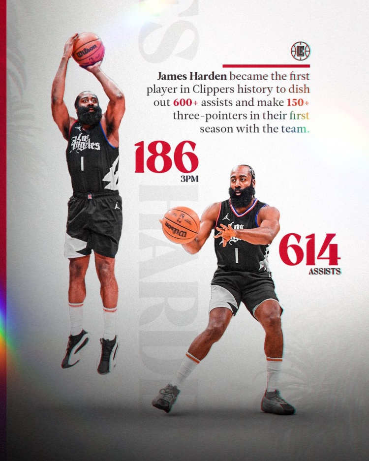 效力首个赛季送出600+助攻&中150+三分 哈登成快船队史首人