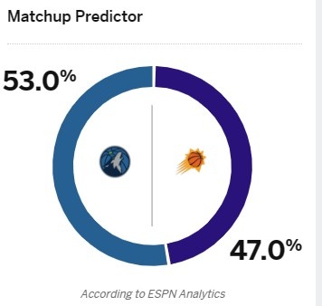 ESPN预测本场比赛太阳胜率47%,森林狼胜率53%。