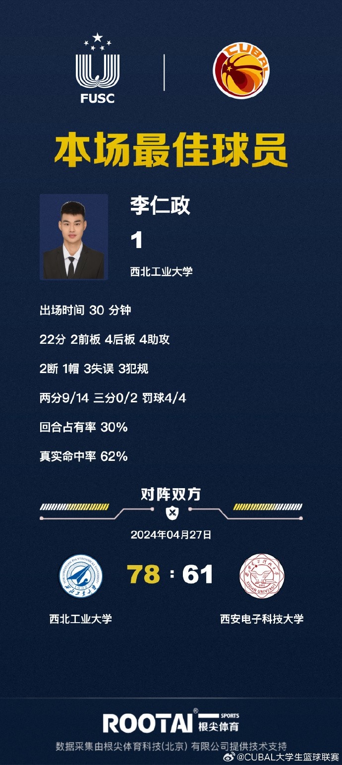 西北工大:李仁政22分6篮板4助攻,张兆兴18分5篮板2助攻,林安10分9篮板,张家豪8分4篮板4助攻5抢断,刘俊希7分6助攻,燕子春7分
