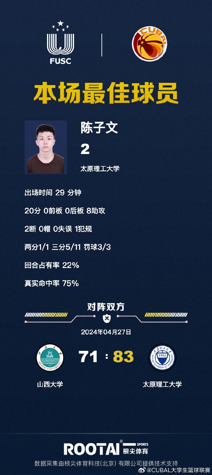 太原理工:曹芷豪25分5板10助、陈子文20分8助、杨子豪12分、杜智博9分、段成果7分7板、孟凡森6分、高家云2分、郑浩楠2分