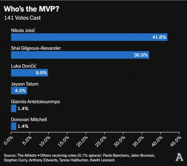 这里有一个不那么大胆的预测:本赛季约基奇赢得MVP的概率,差距将比上图所示的还要大。这些是我们调查的结果,球员们的看法和媒体们的投票结果是截然不同的。