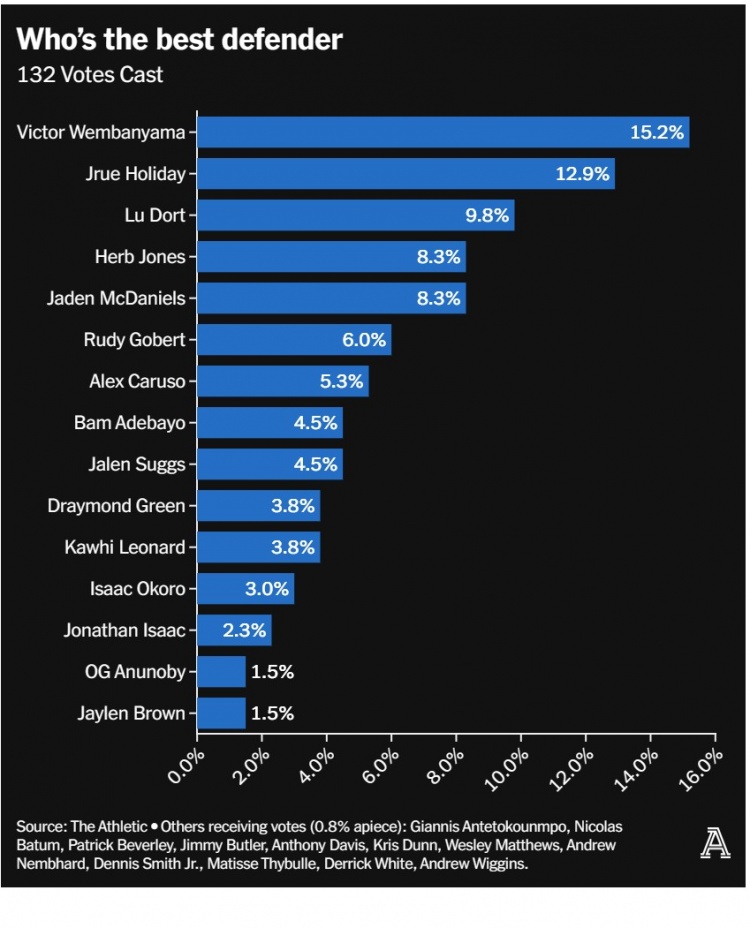 你可能已经注意到了,文班亚马也在这个投票里出现了。考虑到他瘦长的身材,选择他似乎不太正确,但是,毫无疑问,他也得到了球员们的投票。至于原因?他的覆盖面积可是非常大的。