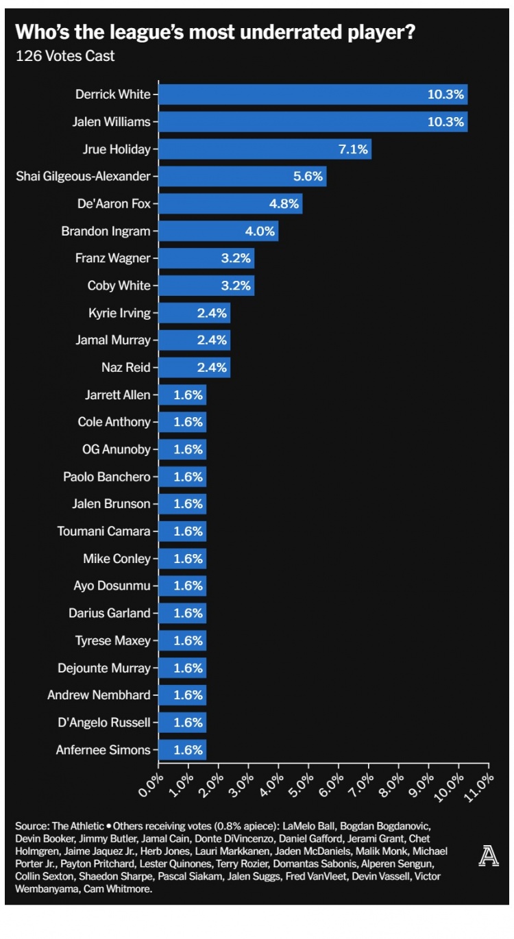 一名给SGA投票的球员说:“我不知道还能不能说他被低估,因为他已经开始得到应有的回报了,但从球员的角度来看,这些回报对他而言是不够多的。他今年的表现,包括取得的进步,我不知道他是否是被低估,但这就像以前人们谈论利拉德在开拓者时的表现一样,他是如何带领球队的(因为库里的存在)。但如果你去问一些球员的话,他们会说SGA是联盟最好的后卫之一,排在前两名。所以,我们已经开始看到了人们对亚历山大的一些评价了。”