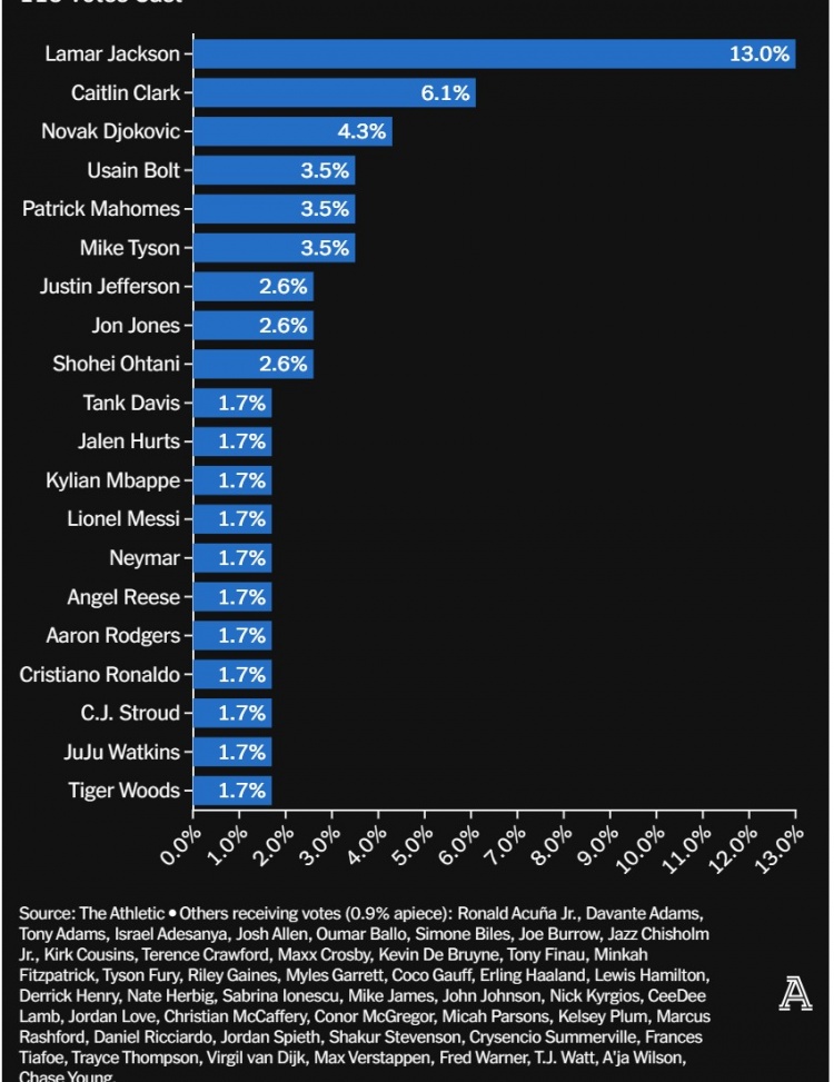 考虑到NFL在北美体育界的低位,这些橄榄球运动员在这个投票中占主导地位,也就不足为奇了。杰克逊是巴尔的摩乌鸦队的四分卫,上赛季她赢得了自己第二个MVP,在NBA里,他也有一群拥簇。