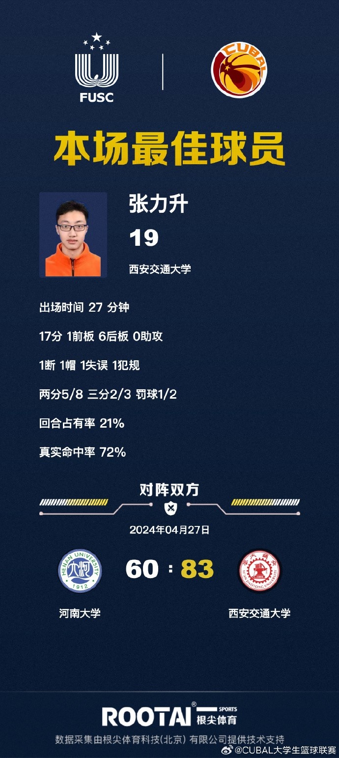 西安交大:张力升17分7板,赵晨曦15分10板,胡耘逍13分5板,邱冬薏8分8板,杜香墨8分