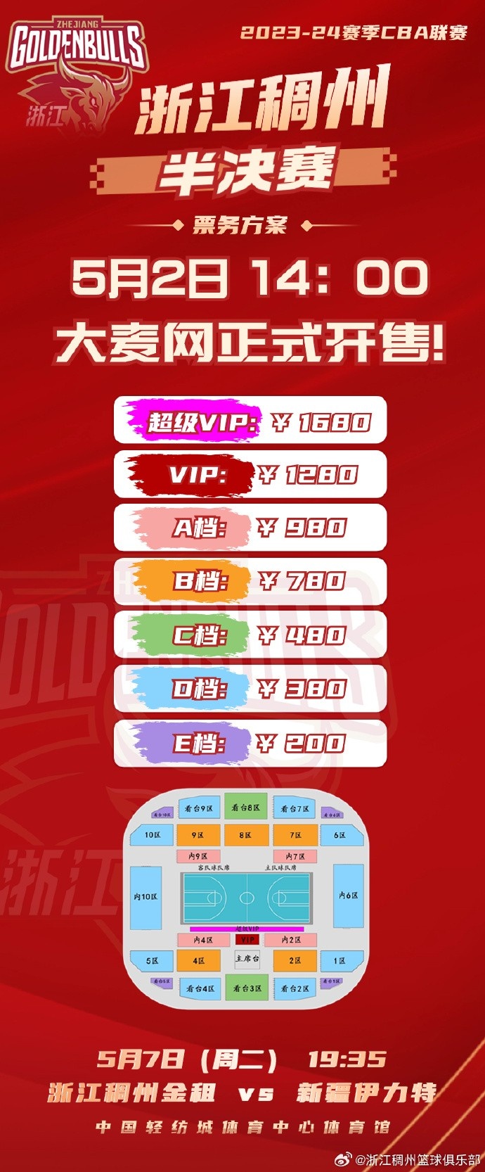 “浙江稠州金租男篮将先赴新疆力拼5月2日、5月4日两个客场,5月7日(周二)半决赛首个主场,将在中国轻纺城体育中心体育馆继续打响!5月7日全场球迷赠送俱乐部助威毛巾! ”浙江男篮在官博上写道。