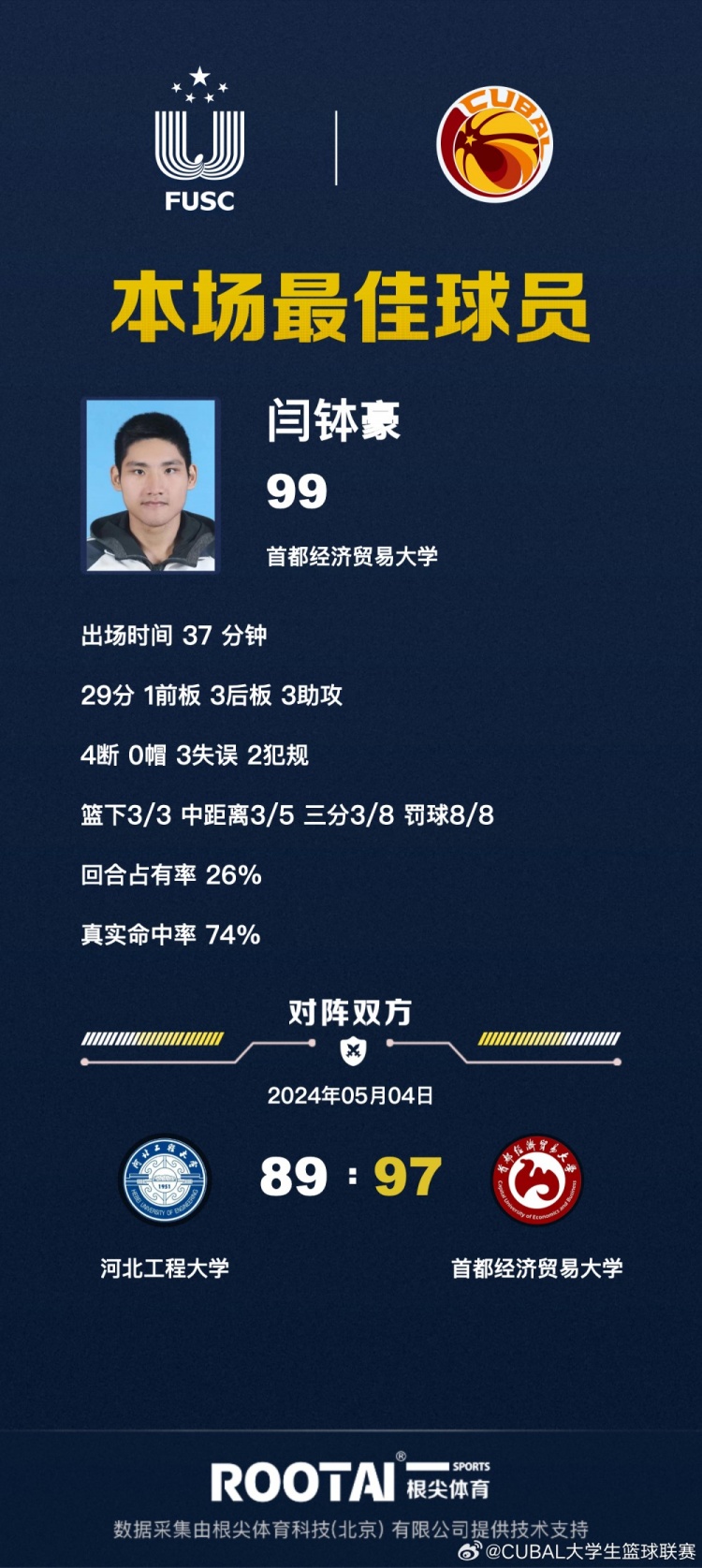 首都经贸:闫钵豪29分4板3助、符骏20分6板、张若宸13分、谢哲卿15分10板、薛海海8分5板、杨涛硕3分、邓文捷2分4板、张鑫茂2分5板、朱睿泽5分