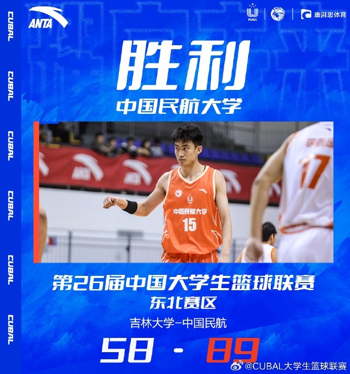 第四节,高宇坤三分还有,中国民航大学内外开花继续扩大优势,吉林大学进攻端连续打铁,中国民航大学利用反击将分差拉开到30分以上,最终,中国民航大学89-58大胜吉林大学。