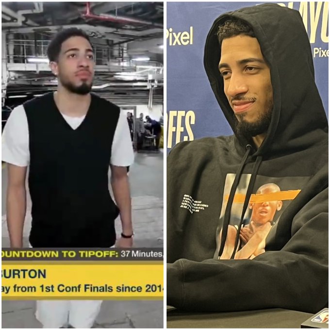 05月21日讯 在昨日抢七大战战胜尼克斯之后,哈利伯顿在赛后采访时穿上了一件步行者名宿雷吉-米勒对尼克斯球迷锁喉的经典卫衣。