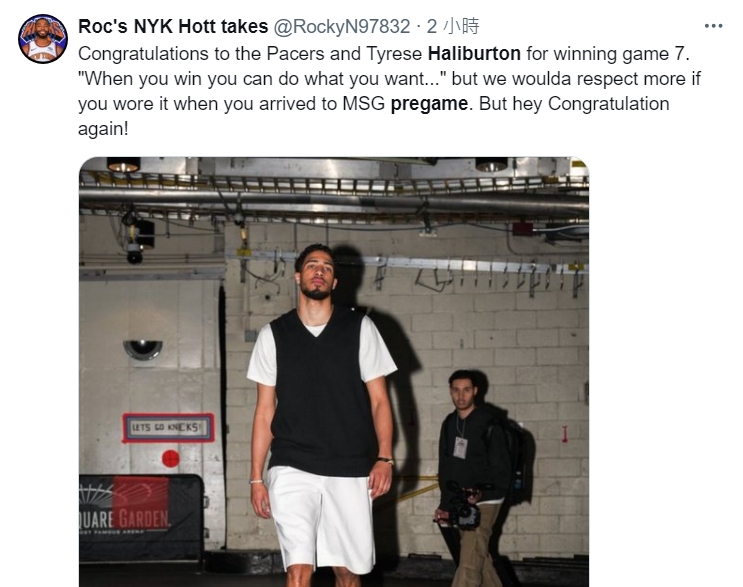 这引发了尼克斯方面球迷对哈利伯顿的不满——哈利伯顿赛前并没有穿这件衣服,尼克斯球迷认为哈利伯顿是在赢球之后才换上这件衣服,认为这是懦夫之举。