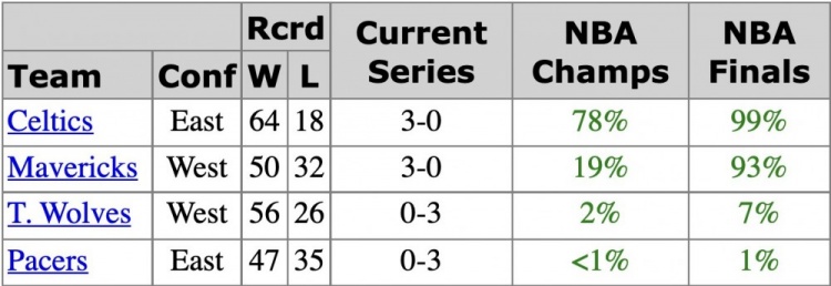 夺冠概率:绿军78%,独行侠19%,森林狼2%,步行者不足1%