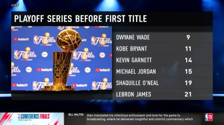 赛前转播方晒出数据,列举了多位NBA巨星拿到生涯首冠前所打的系列赛数量,其中: