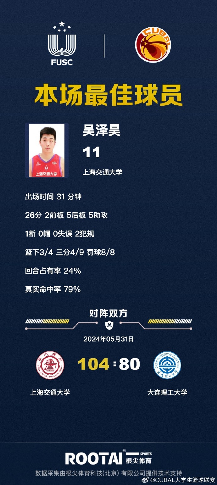 上海交通大学:吴泽昊26分7篮板5助攻、顿家威21分2篮板2抢断、陈天灿13分4篮板6助攻5抢断、刘冠男10分7篮板、胡汇5分5篮板5助攻、王岩16分3篮板、冯祥硕6分3助攻。
