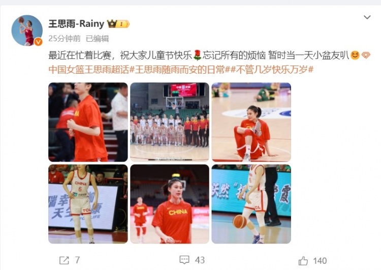 6月1日讯 今日,中国女篮球员王思雨更博,庆祝六一儿童节。