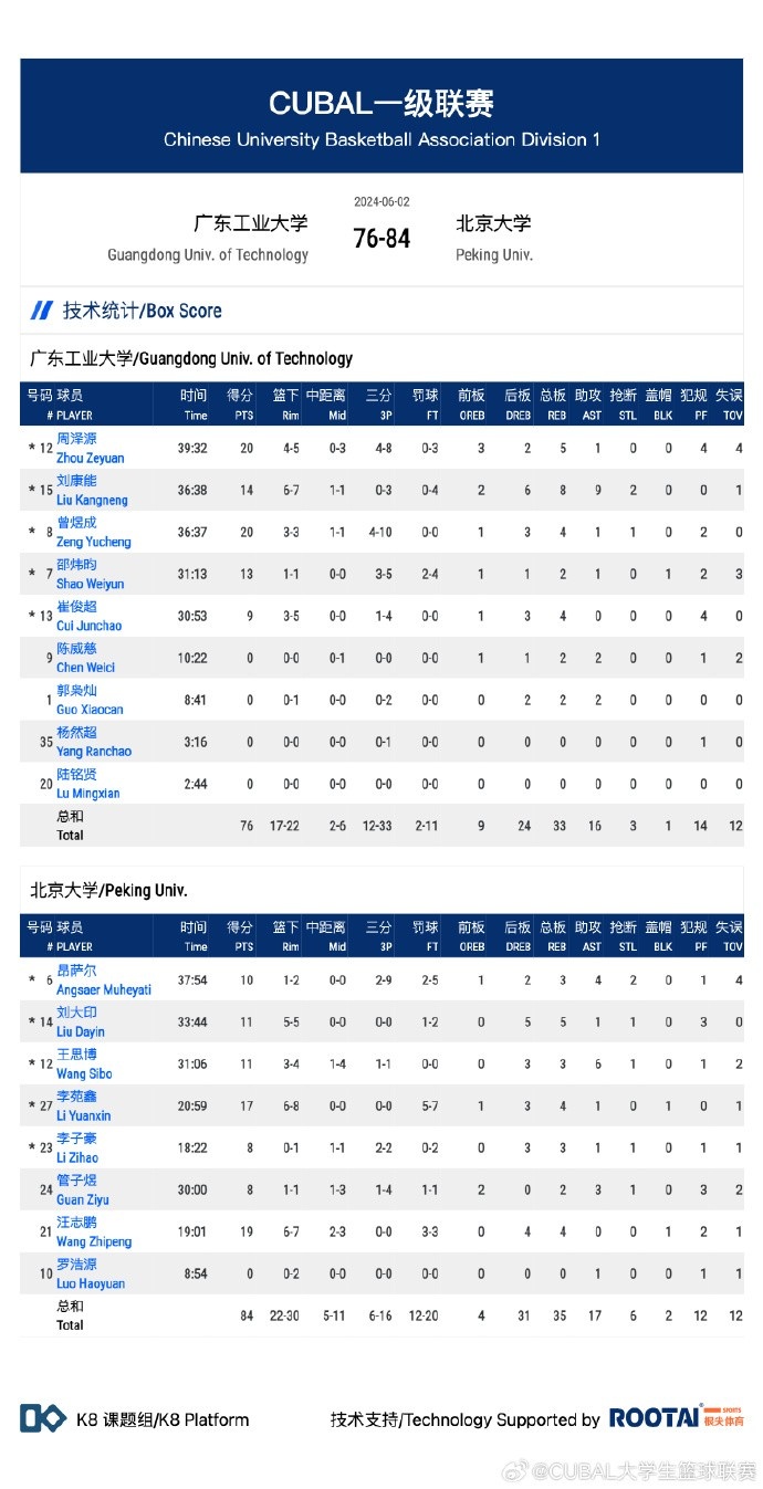 广东工大:曾煜成20分,周泽源20分5板,刘康能14分8板9助,邵炜昀13分,崔俊超9分