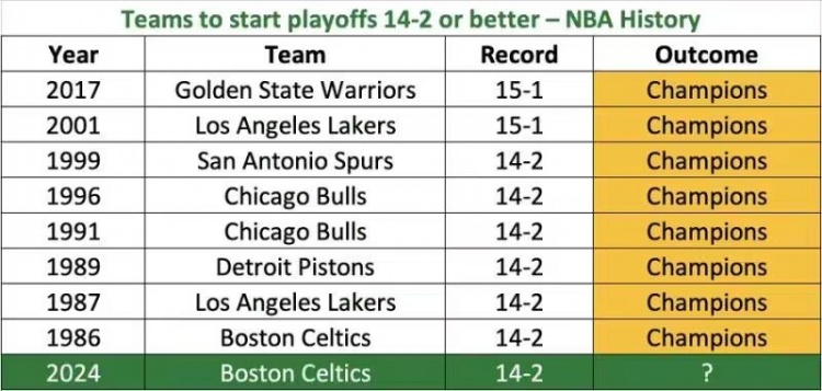 本赛季季后赛到目前为止,凯尔特人取得14胜2负,他们成为历史上第九支至少以14胜2负开局季后赛的球队,此前八支都夺冠了。