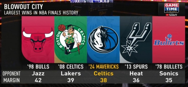2024年总决赛G4,独行侠在主场122比84狂胜凯尔特人38分。本场比赛之前,独行侠大比分0比3落后,在0比3的绝境面前,独行侠打出了绝望感,打出了一场一边倒的比赛,最多时领先达到48分,最终赢了38分。此战之后,独行侠避免了成为NBA历史上第10支在总决赛的舞台上被横扫的球队。