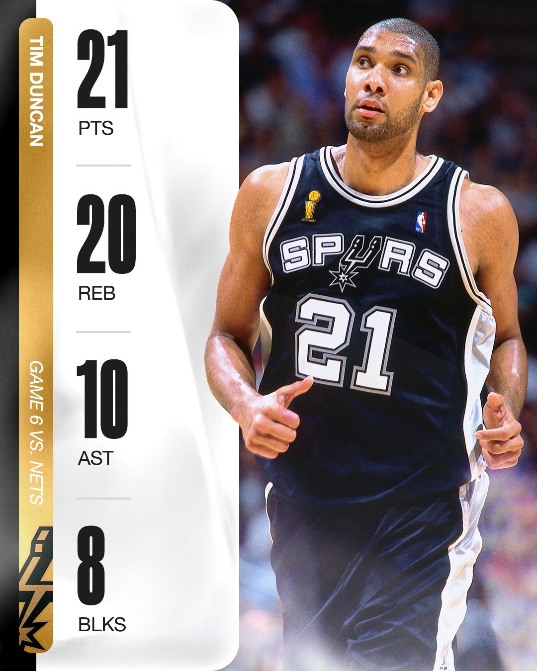 21+20+10+8!21年前的今天:邓肯总决赛准四双带队夺冠!