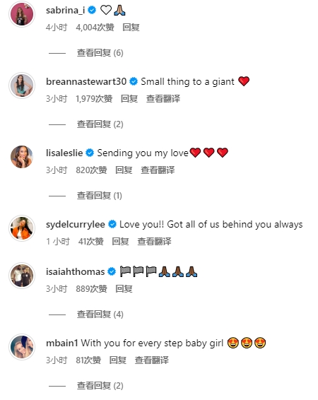 包括斯图尔特、阿贾-威尔逊、约内斯库、里斯、莱斯利、麦克唐纳德(队友)等多位WNBA球员,都在布林克的评论区送上祝福。另外,两位家人母亲Michelle以及库里亲妹妹Sydel也都发布评论为布林克祈福。