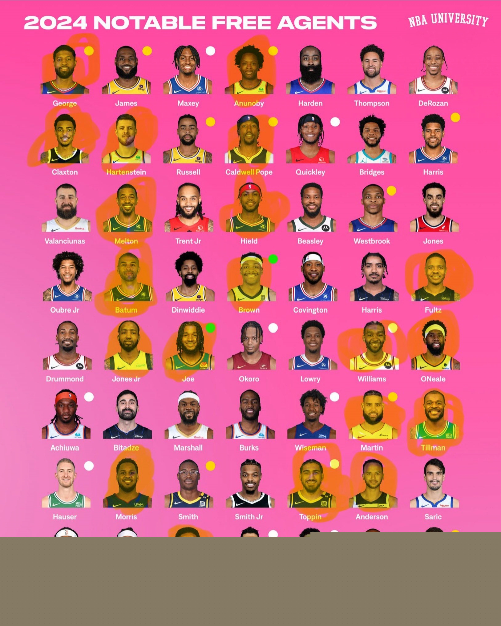 休赛期自由球员,黄点为球员选项,绿点为球队选项(自由市场7月1日正式开启)