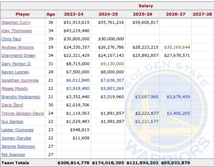 勇士的合同结构并不合理,队伍的核心库里只剩两年,维金斯和追梦却有三年,这三年是勇士自己认为的窗口期。实际上这是夺冠后对维金斯误判造成的,本以为他可以在库里逐渐老去时接过火炬,没想到正好相反,维金斯状态下降。由于维金斯是夺冠功臣,还没要求顶薪,勇士一激动就签长了。