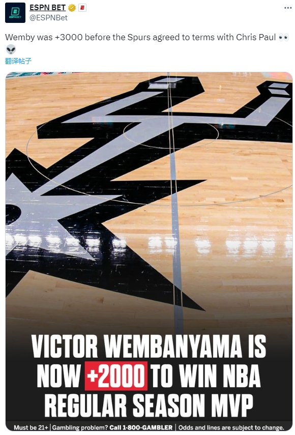 据博彩网站分享,保罗加入马刺后,文班亚马获得MVP的赔率从+3000(押100,中了带本带利得3100)变成了+2000。