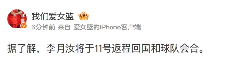 07月09日讯 据微博博主“我们爱女篮”了解到,中国女篮国家队中锋李月汝将于11号返程回国和球队会合。