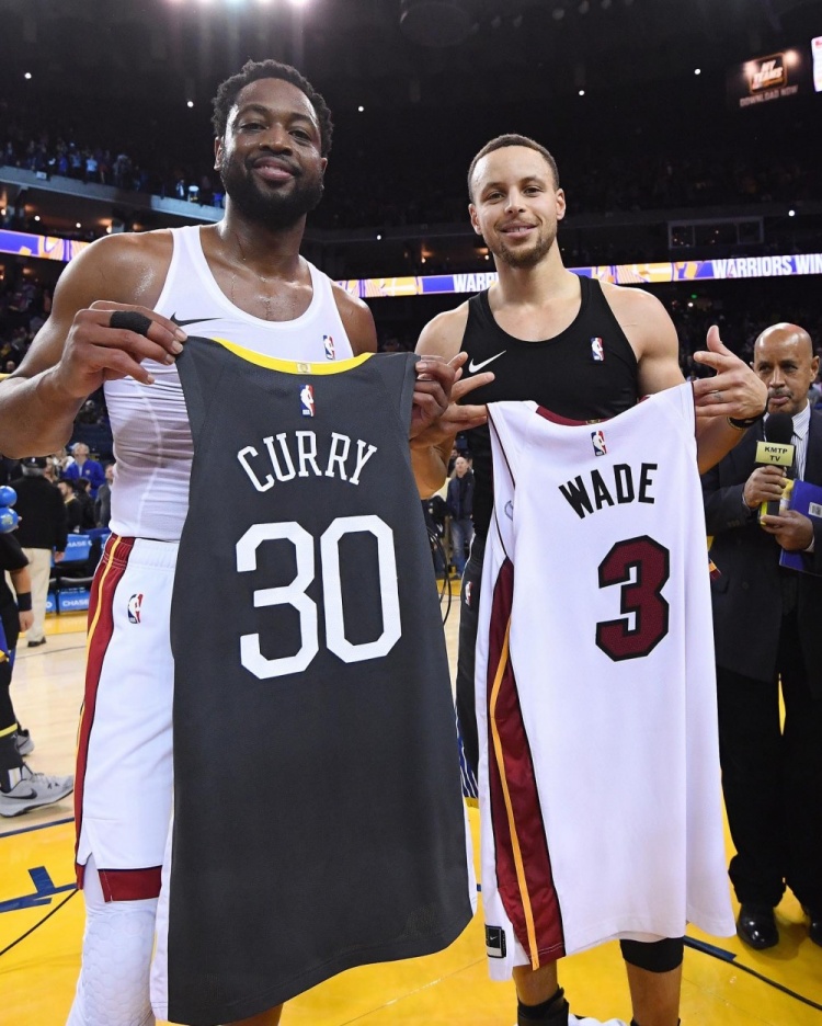 勇士球星库里更新IG晒出自己与韦德合照,图片中韦德抱着库里玩闹,二人喜笑颜开!