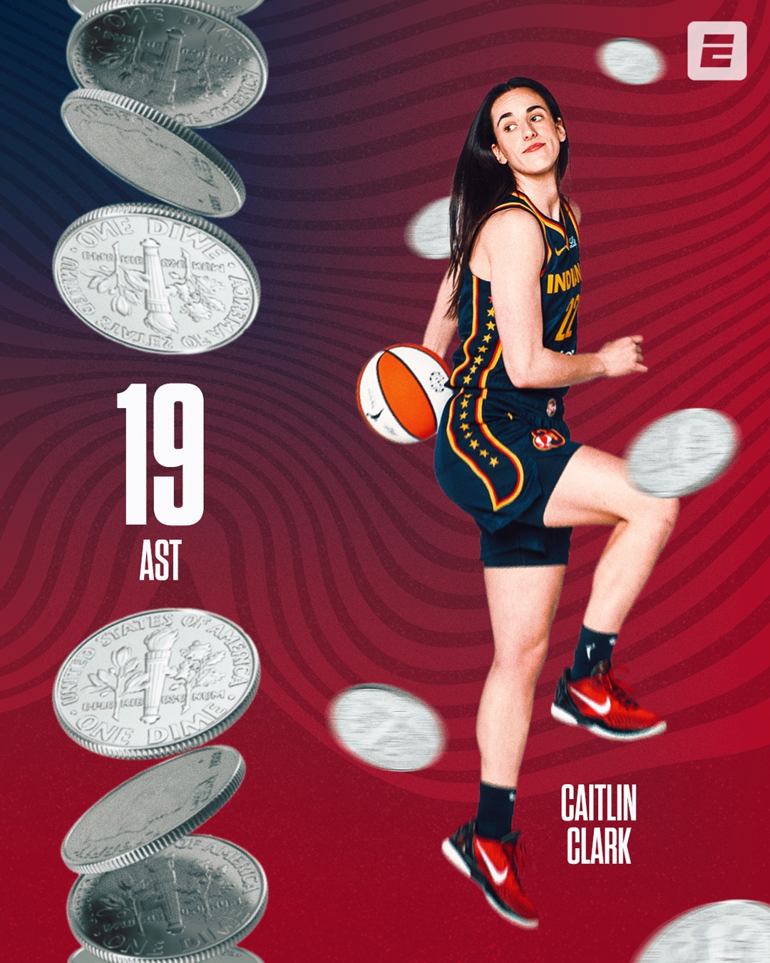 新科状元凯特琳-克拉克送出19助攻,刷新WNBA单场助攻历史记录,此前的纪录是18助,属于自由人后卫Courtney Vandersloot。