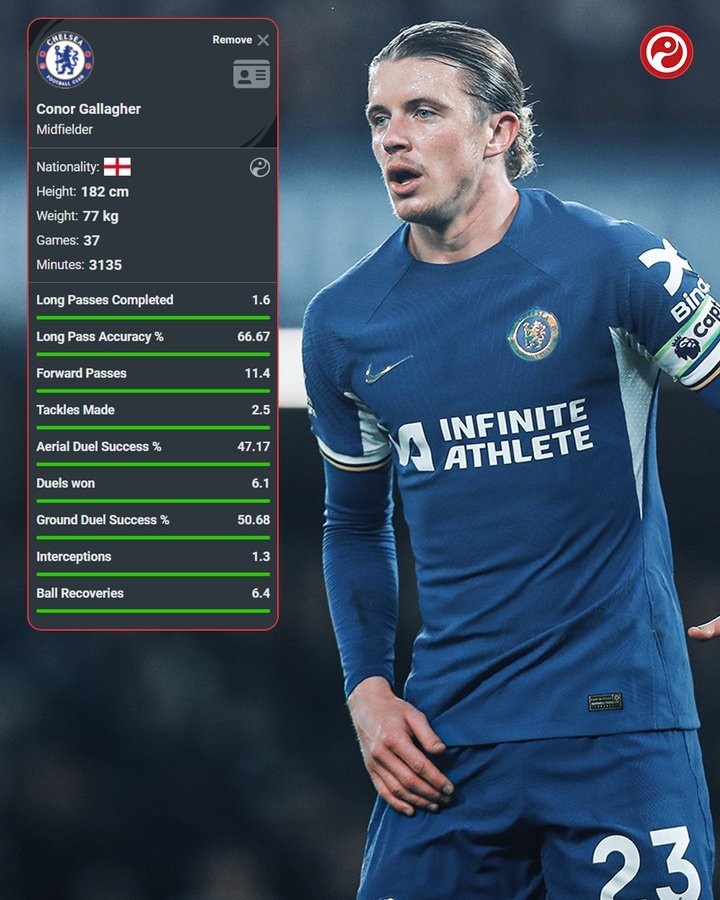 加拉格尔上赛季英超数据:赢得球权、拦截等6项数据队内第一
