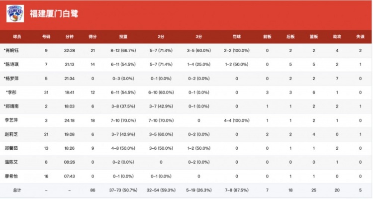 本场比赛福建厦门白鹭全员上场,四人得分上双,肖婉钰全面爆发,砍下21分2篮板4助攻3抢断。李艺萍带伤出战依然拿到18分,陈诗琪14分,李彤12分。