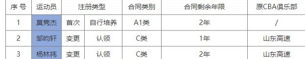 其中,深圳新认领了杨林祎(此前在深圳效力9年)和邹昀轩,同时与莫隽杰签下两年A1类合同。