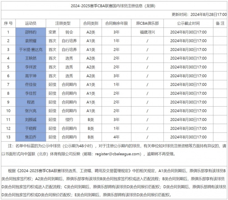 8月28日讯 今天,CBA官方更新了新赛季广州男篮第一批注册信息,A类合同刷屏。