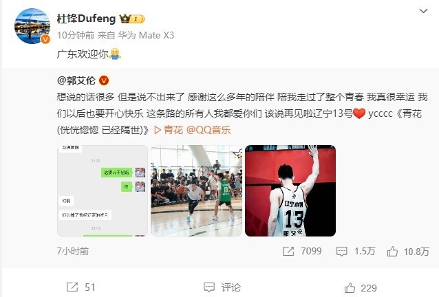 广东宏远男篮主帅杜锋转发并评论道:“广东欢迎你。”