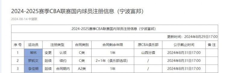 8月29日讯 今天,CBA官网更新了宁波新赛季注册名单。