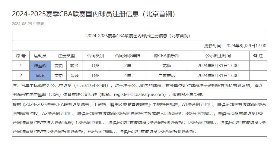 08月29日讯 CBA官网更新国内球员注册名单,北京首钢注册新援周琦和陈盈骏。
