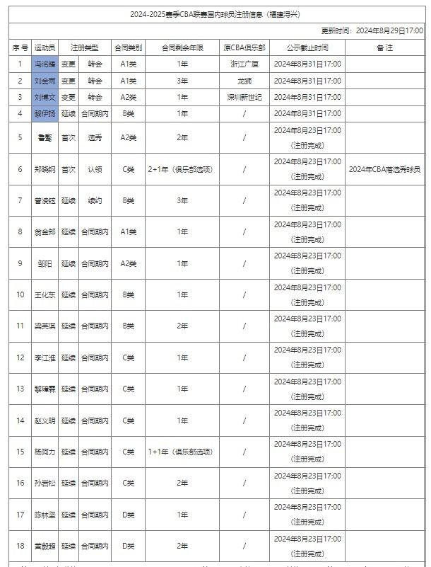 其中,福建新增了黎伊扬的注册信息,他的B类合同还有1年,同时,刘博文、刘金雨、冯洺臻3人转会加盟福建。