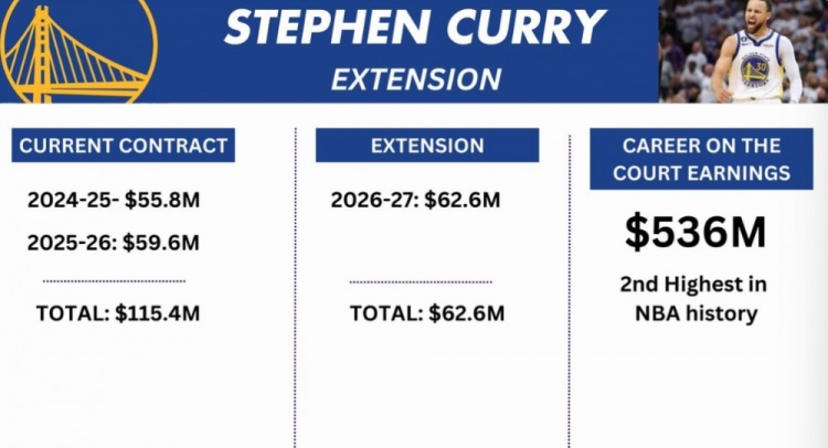 库里生涯的薪资总额将突破5亿美元,达到5.36亿美元(历史第二高、仅次于詹姆斯),加入詹姆斯、杜兰特和乔治的行列。