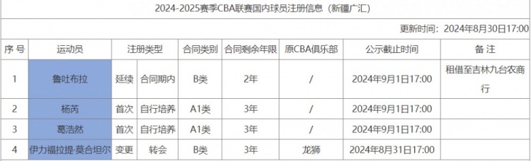 8月30日讯 今天,CBA官方更新了新赛季新疆男篮注册信息。