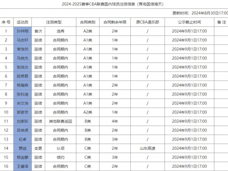 8月30日讯 今天,CBA官方更新了新赛季青岛男篮注册信息。