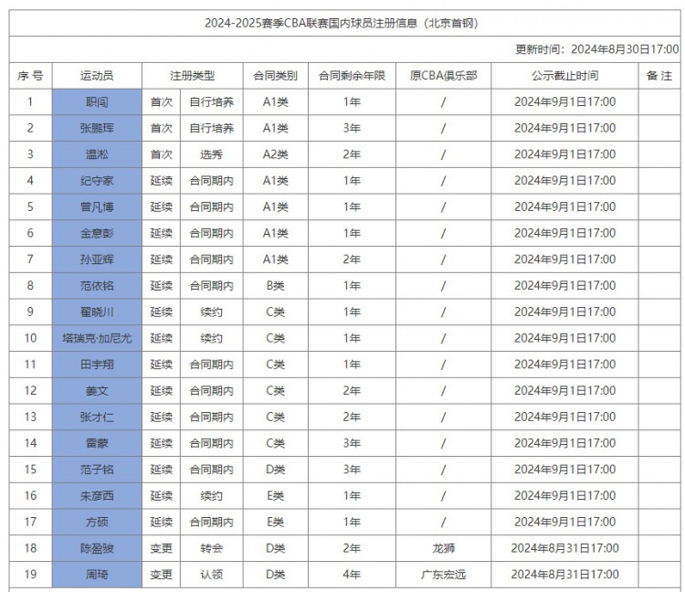 8月30日讯 今天,CBA官方更新了新赛季北京男篮的注册信息。