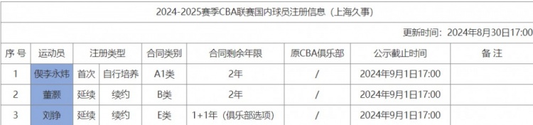 8月30日讯 今天,CBA官方更新了新赛季上海男篮注册信息。