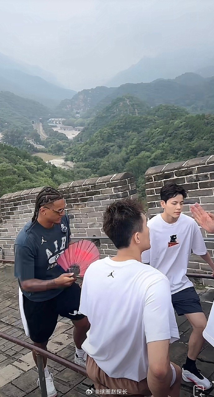 同为AJ代言人的郭艾伦和杨舒予,与正在中国行的东契奇、塔图姆、锡安和班凯罗会合,六人一起同游长城。
