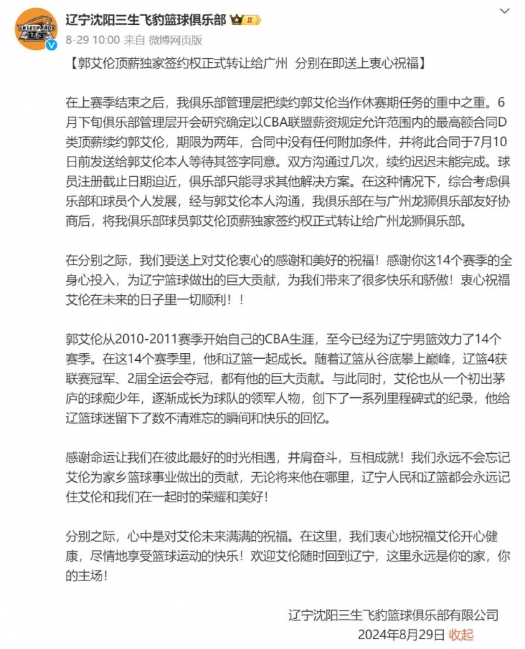 而在多方面的不断猜测之后,辽宁队发出了这条看似送别,却夹杂信息的公告。上面写着,辽宁队曾经提供两年顶薪,但郭艾伦并没接受。