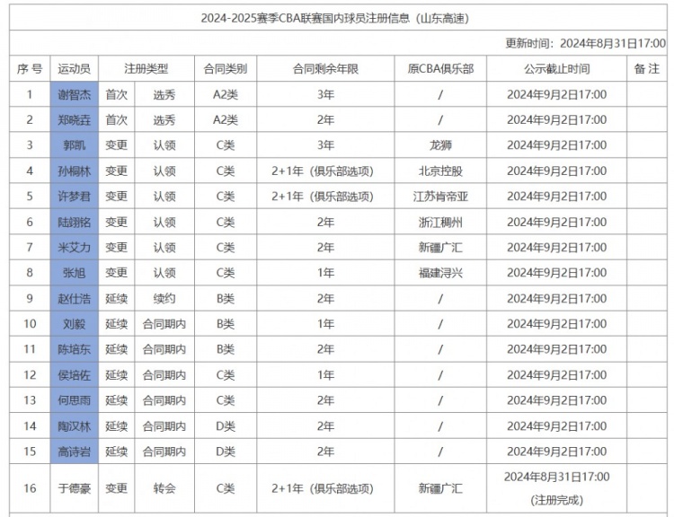 8月31日讯 今天,CBA官方更新了新赛季山东男篮的注册信息。
