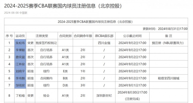 8月31日讯 今天,CBA官方更新了新赛季北控男篮的注册信息,新增了6人完成注册。