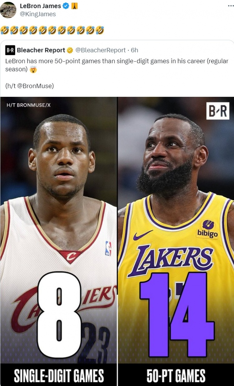 9月4日讯 据美媒统计,詹姆斯生涯单场个位数得分比赛共8场 而单场50+有14场。