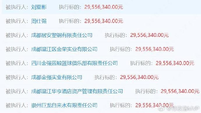 9月3日,四川金强男篮被广西南宁青秀区法院执行了超过2955万元,同案一并被执行的还有周仕强本人以及其名下的其它企业,共计八家机构或个人,合计被执行金额超过2.36亿元。此前在6月份,四川金强男篮就被同一家法院冻结了自己持有的CBA公司5%的股权(股本金为300万)。