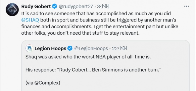 戈贝尔刚刚转发奥尼尔采访视频,并回应道:“看到像你一样在体育和商业上都取得如此成就的人,仍然被另一个人的财务状况和成就所左右,真的可悲,我知道娱乐的部分,但不像其他人,你不需要这些东西来吸引眼球。”