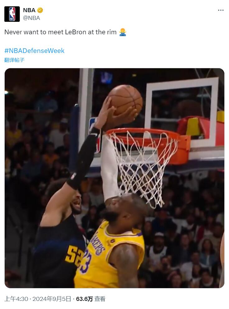 09月06日讯 本周是NBA发起的防守周集锦时间,NBA官方晒出了詹姆斯封盖穆雷的视频,并写道:“你永远不想在篮下遇到勒布朗。”